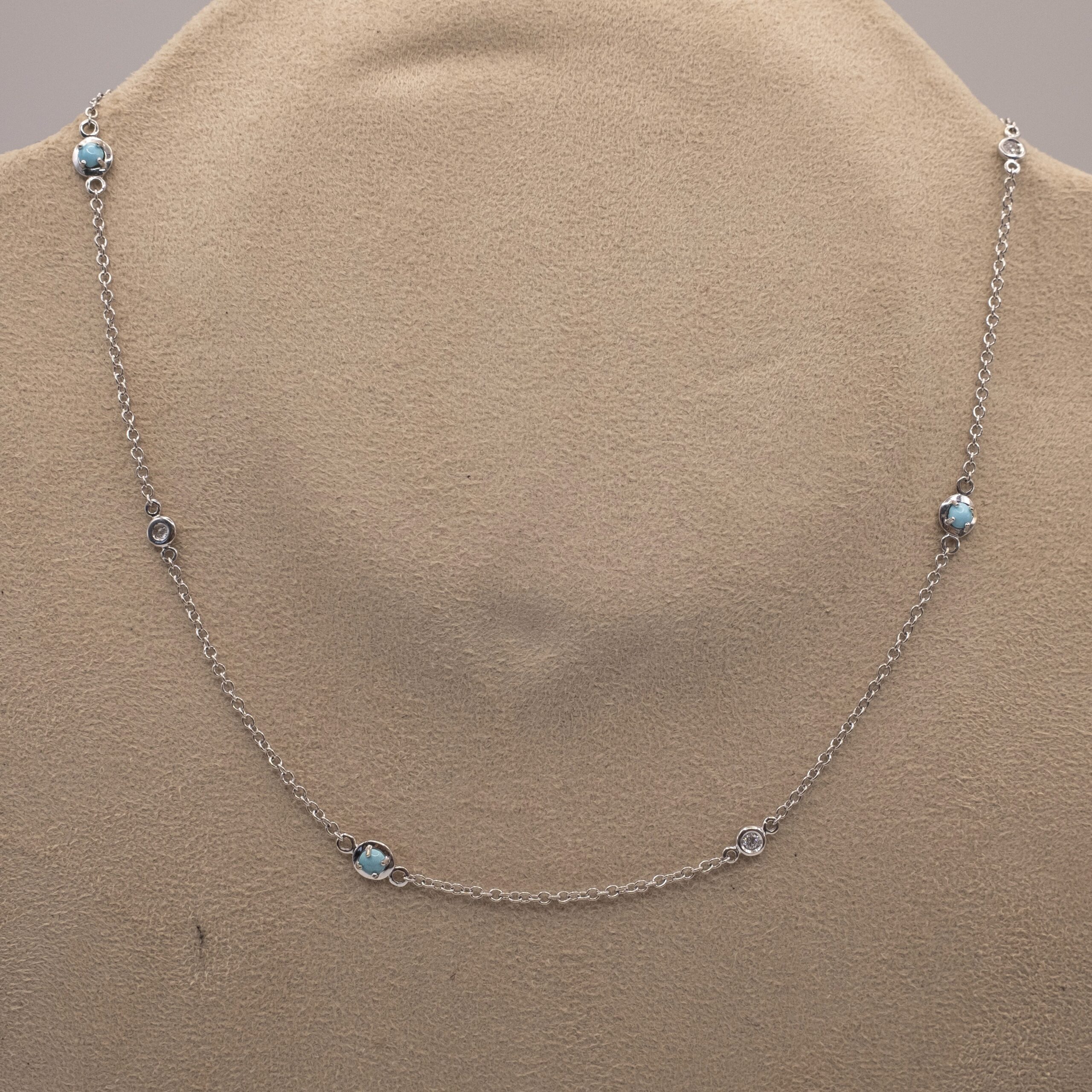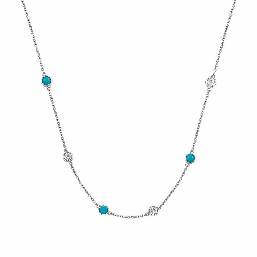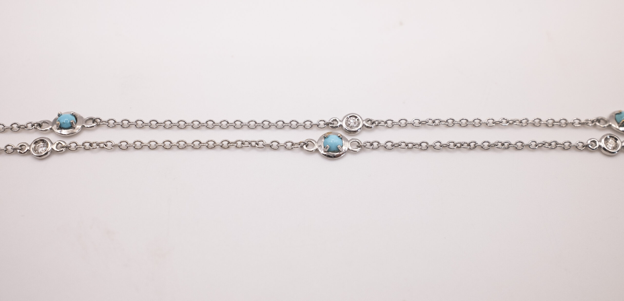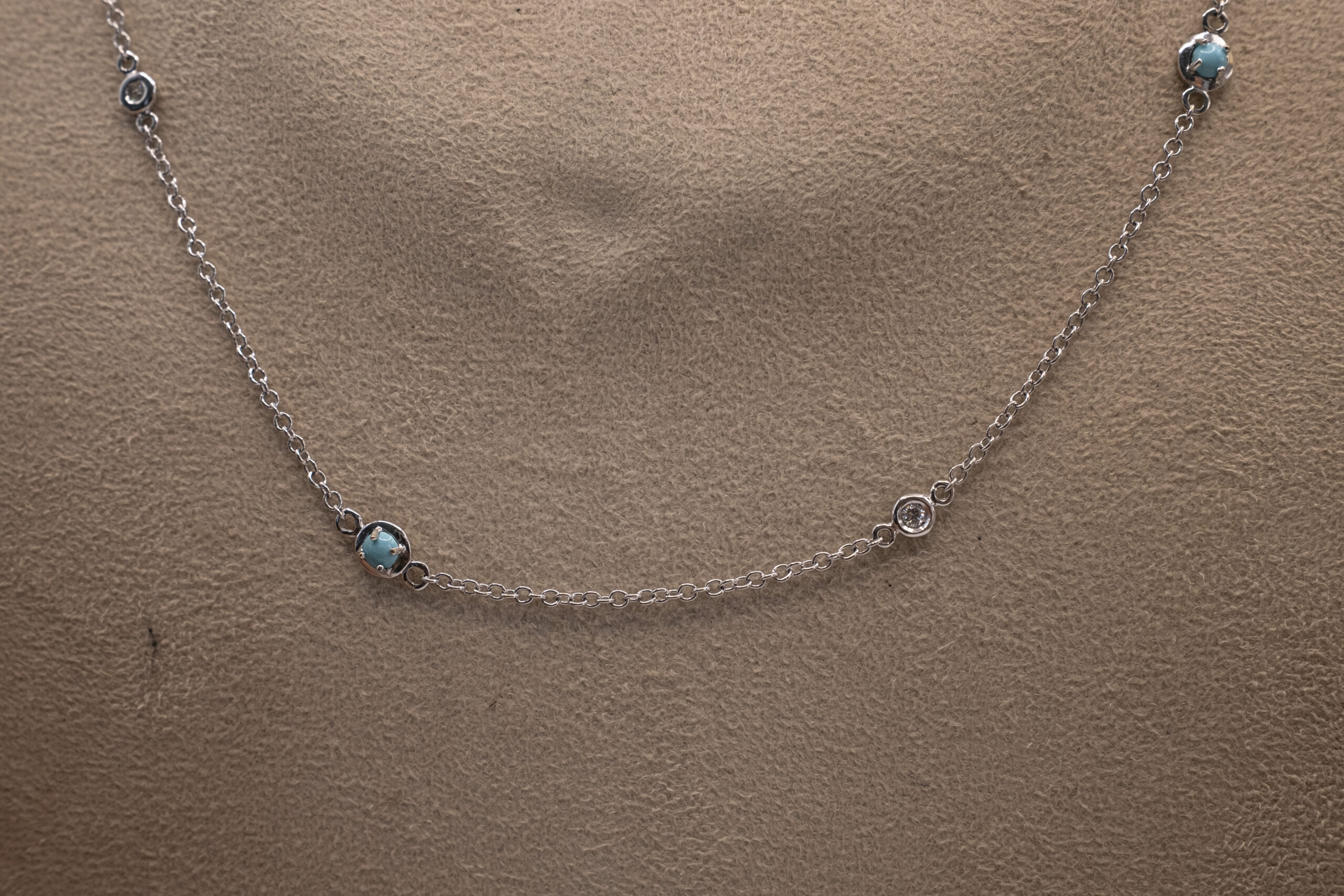 Necklace IS123 with 4 diamonds of 0.10ct, 4 turquoise of 1.55ct and 3.80g of 18kt white gold