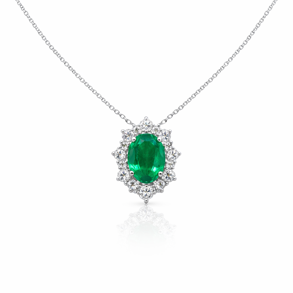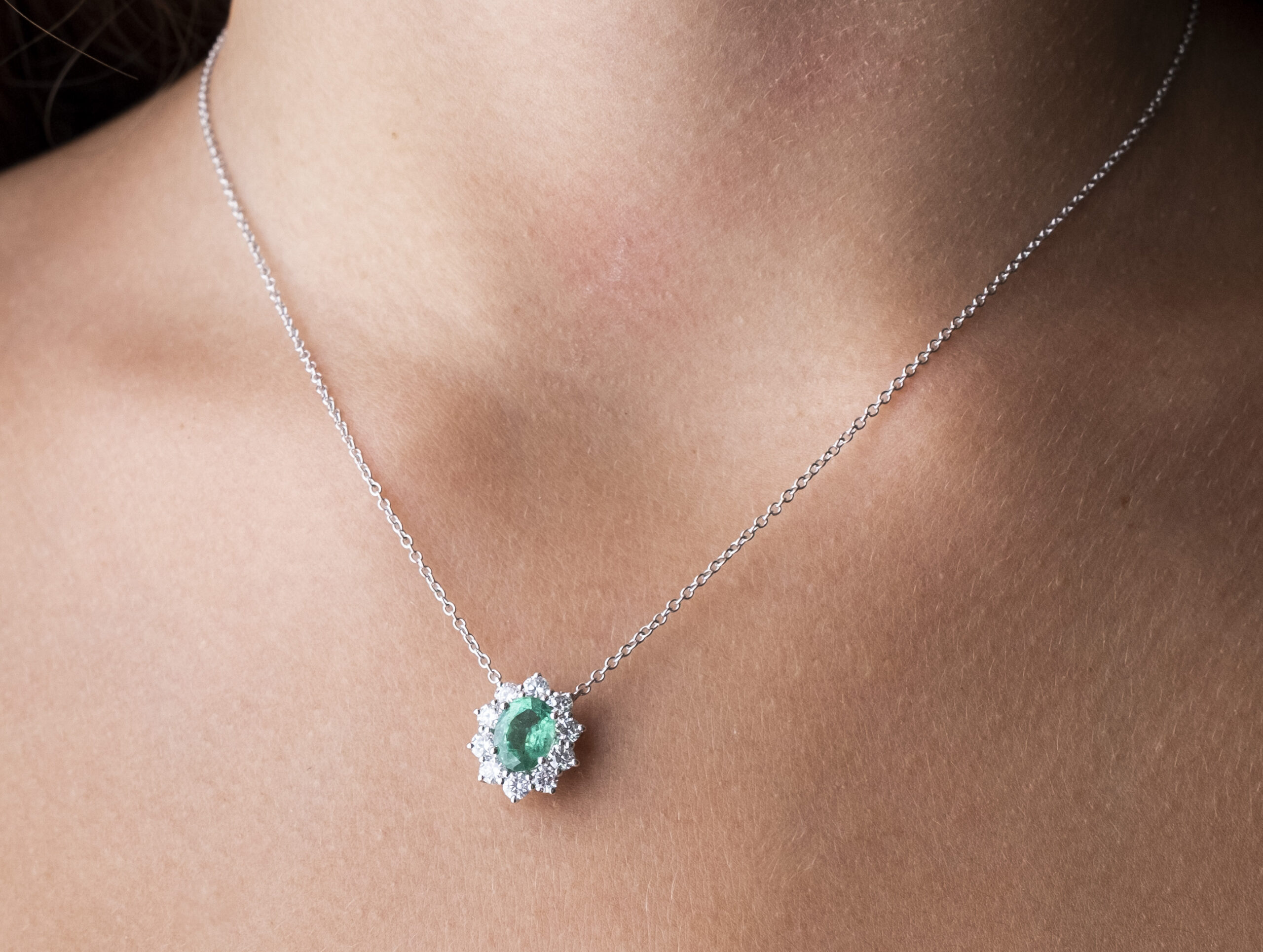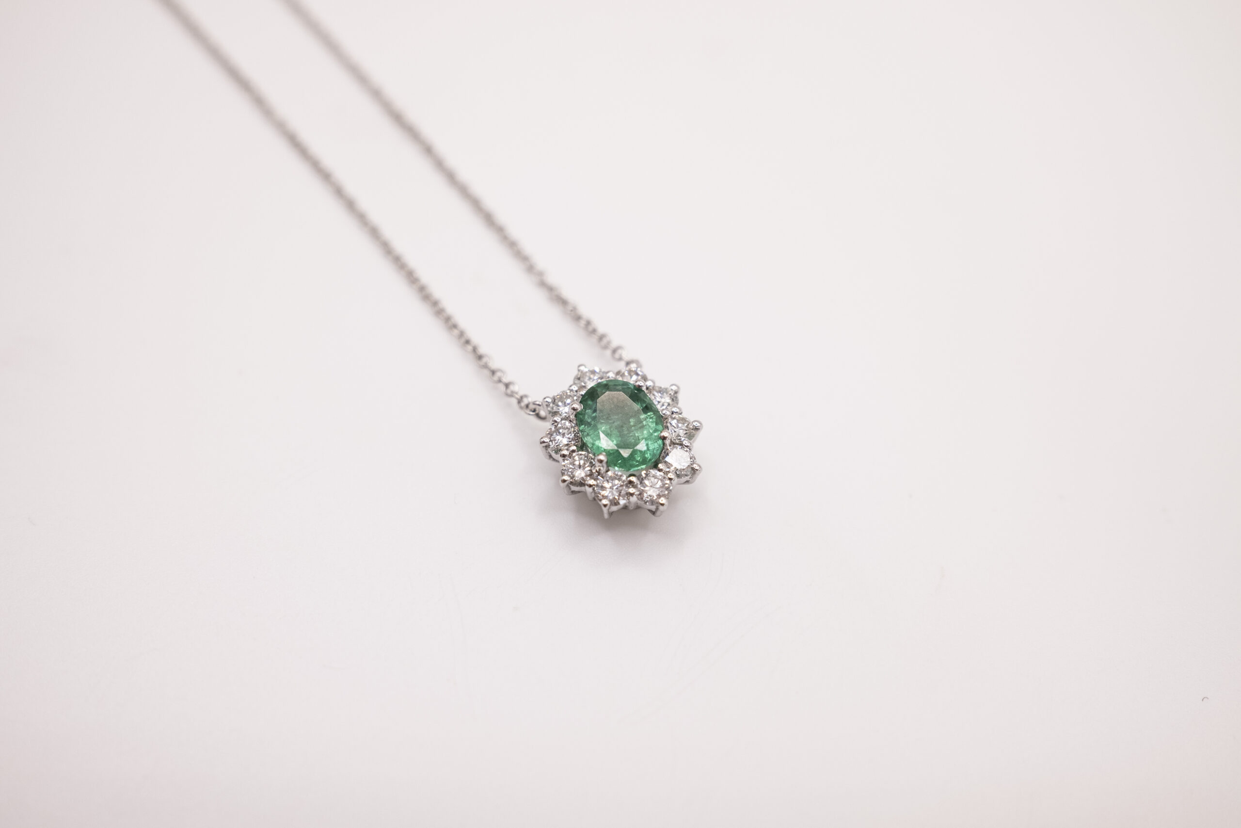 Necklace IS63 with 1 emerald of 1.27ct, 10 diamonds of 0.84ct and 3.60g of 18kt white gold