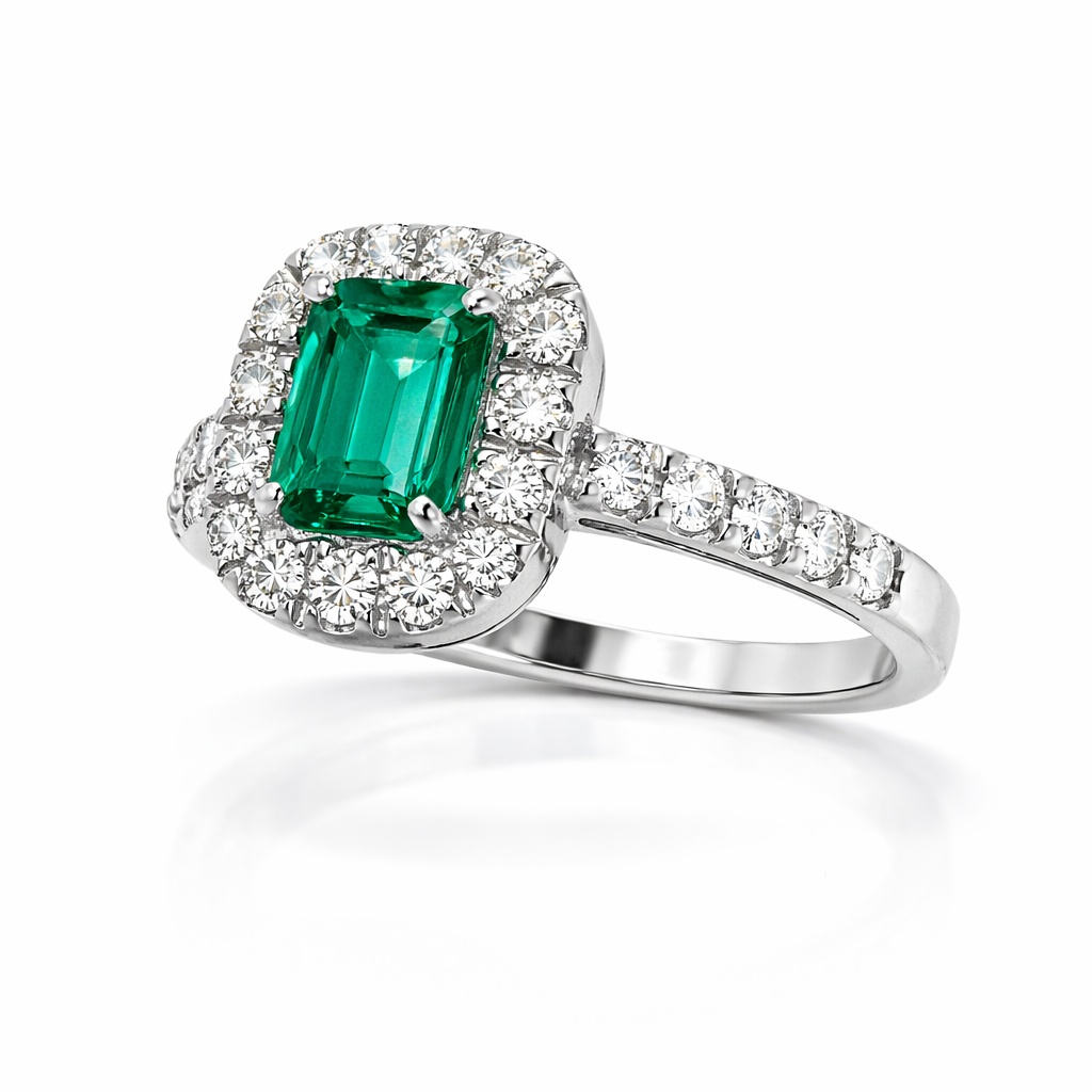 Ring IS12 with 1 emerald of 1.25ct, 20 diamonds of 0.51ct and 4.20g of 18kt white gold