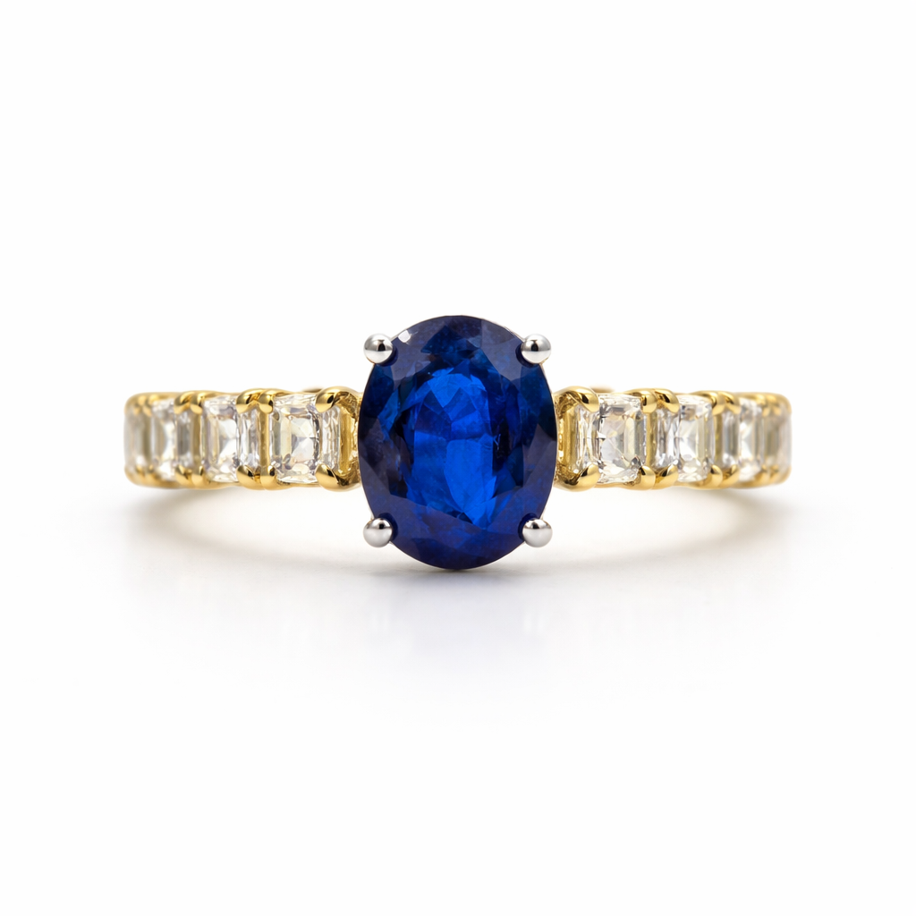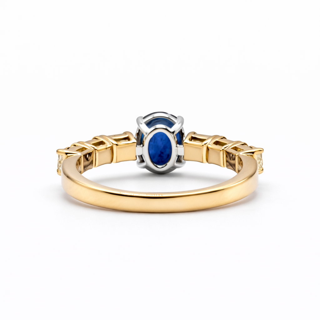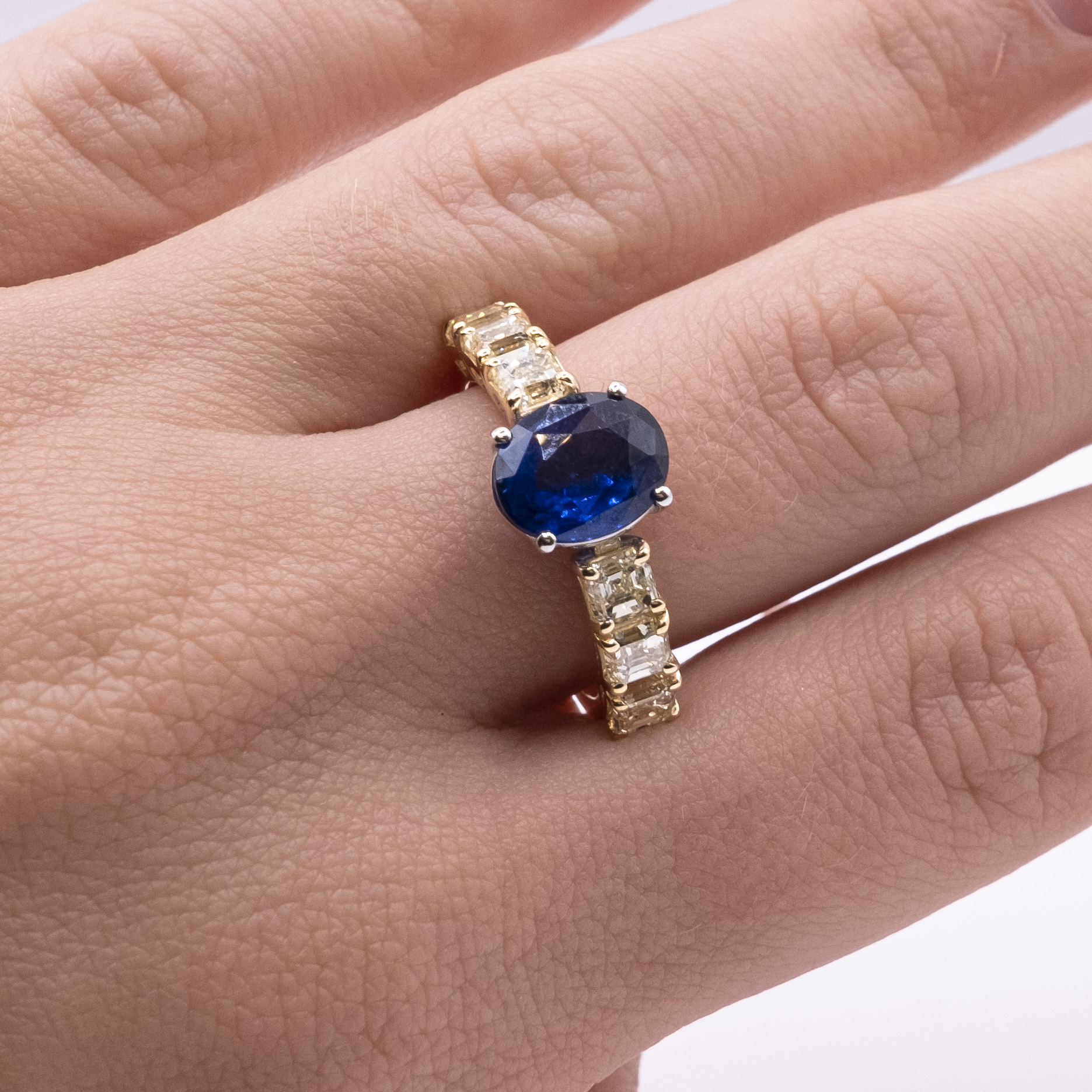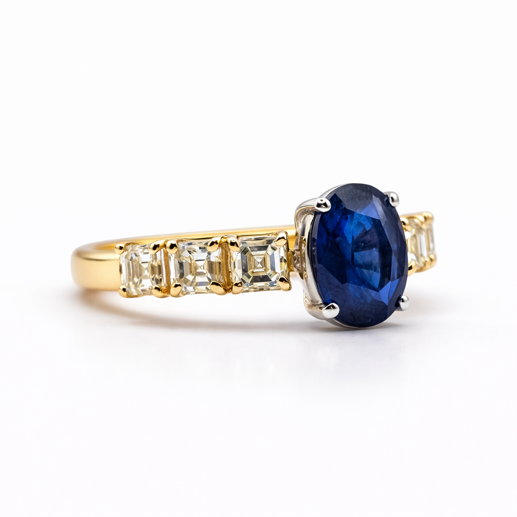 Oval Sapphire 2.46ct, 6 Princess Fancy 1.83ct, 4.25g 18kt Yellow Gold