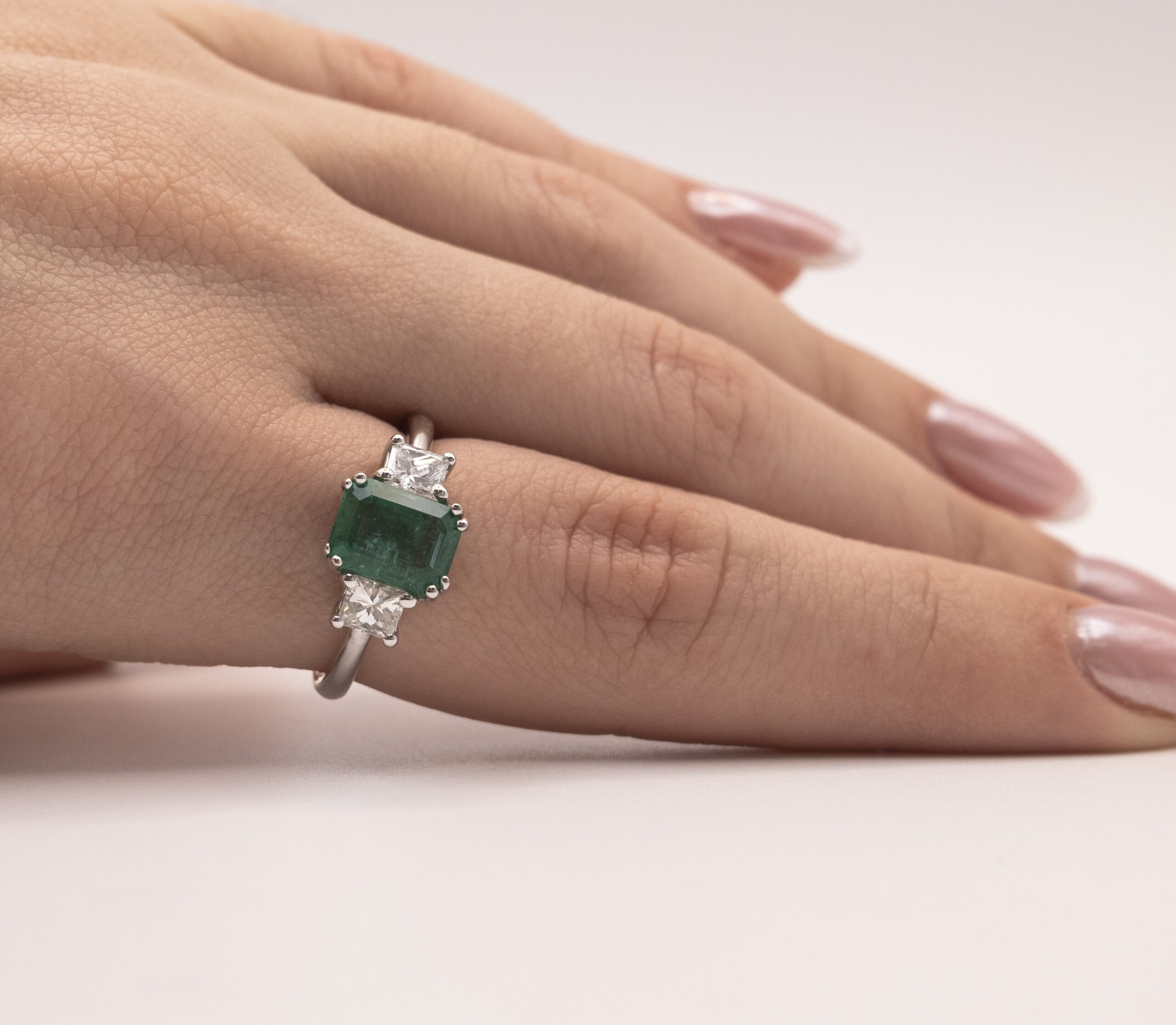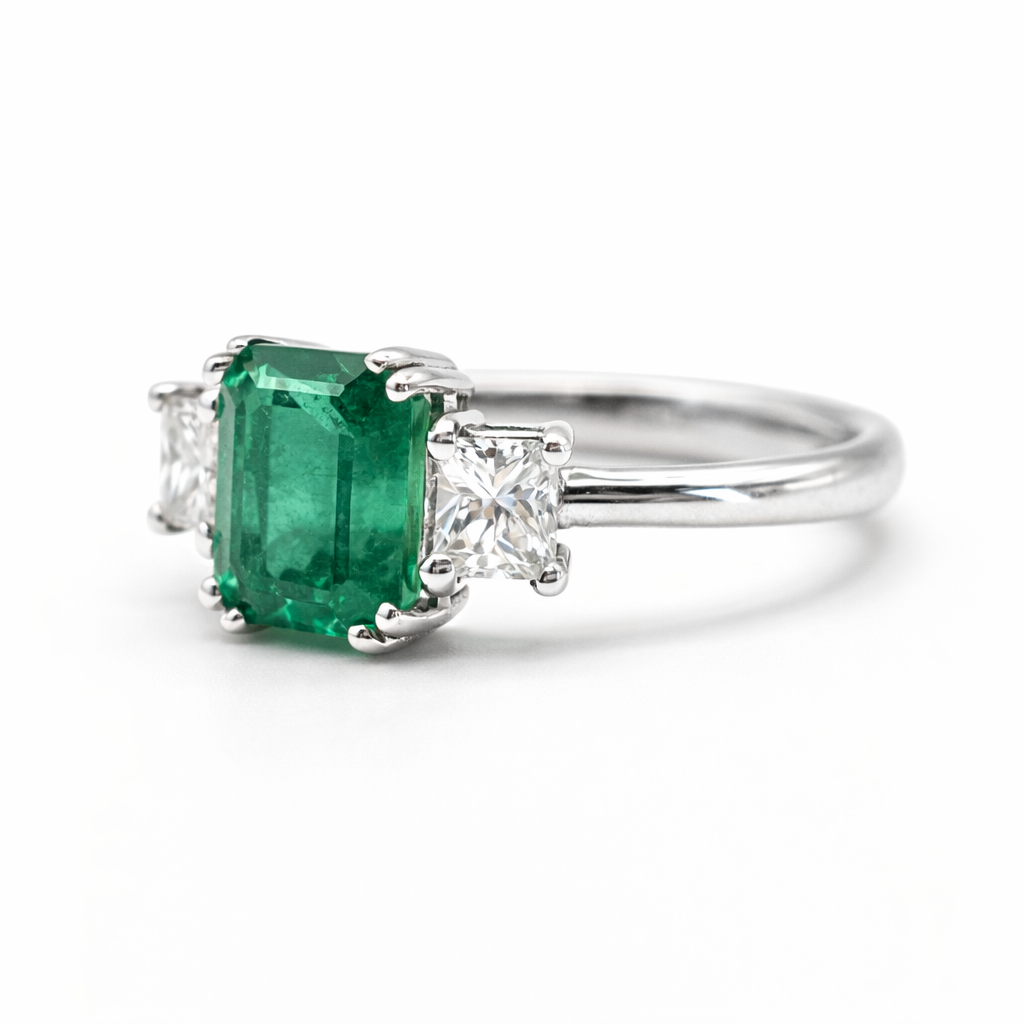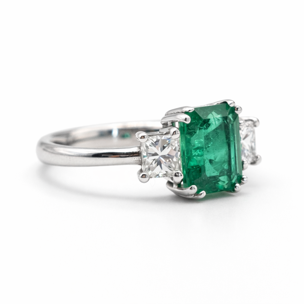 Ring JYD2 with 1 emerald of 1.69ct, 2 diamonds of 0.60ct and 3.24g of 18kt white gold