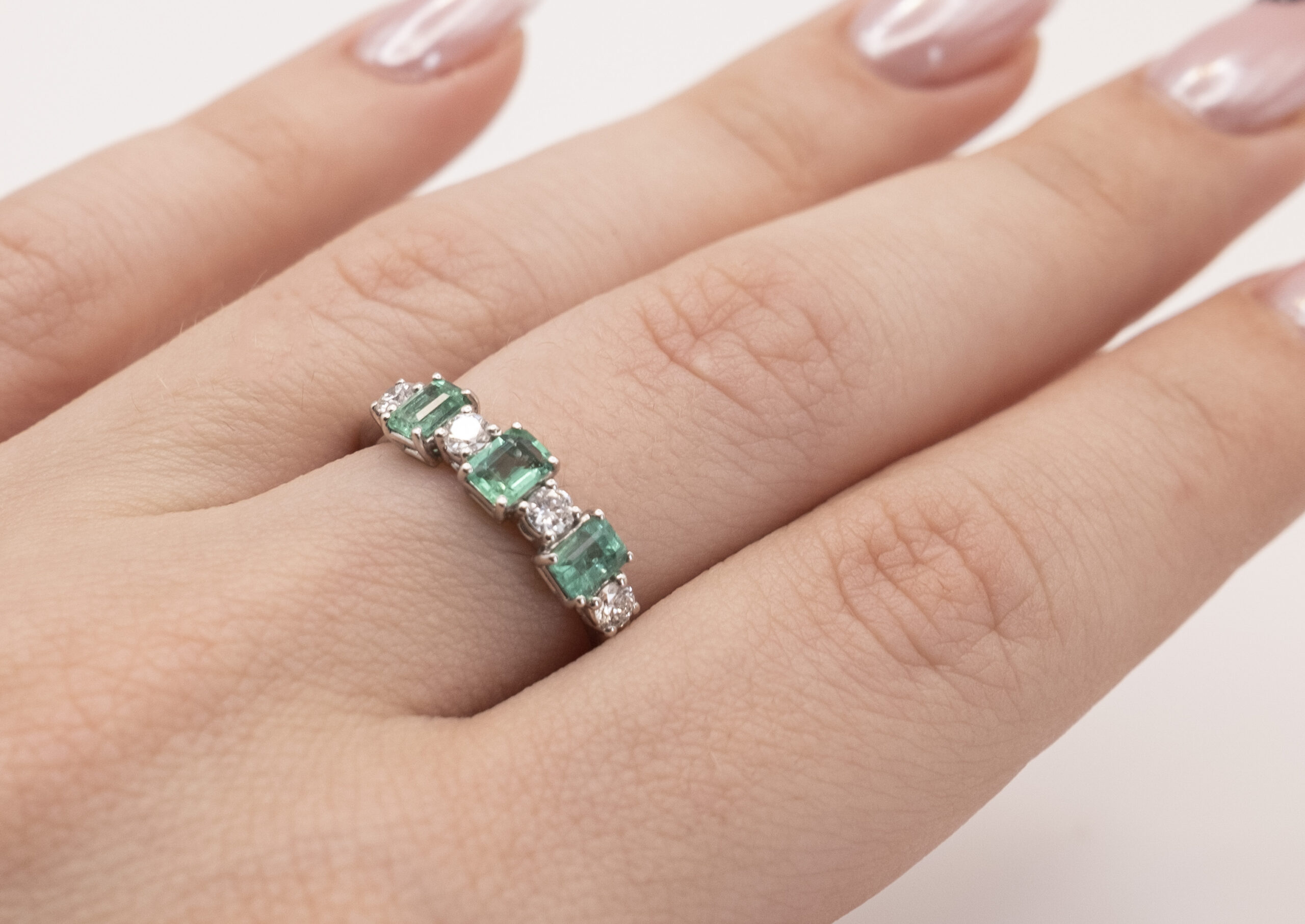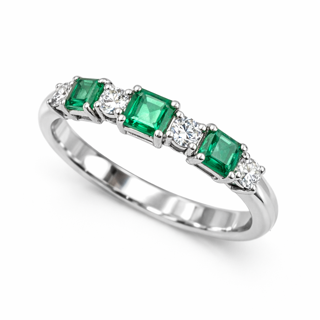 Ring JYD4 with 3 emeralds of 0.60ct, 4 diamonds of 0.24ct and 2.75g of 18kt white gold