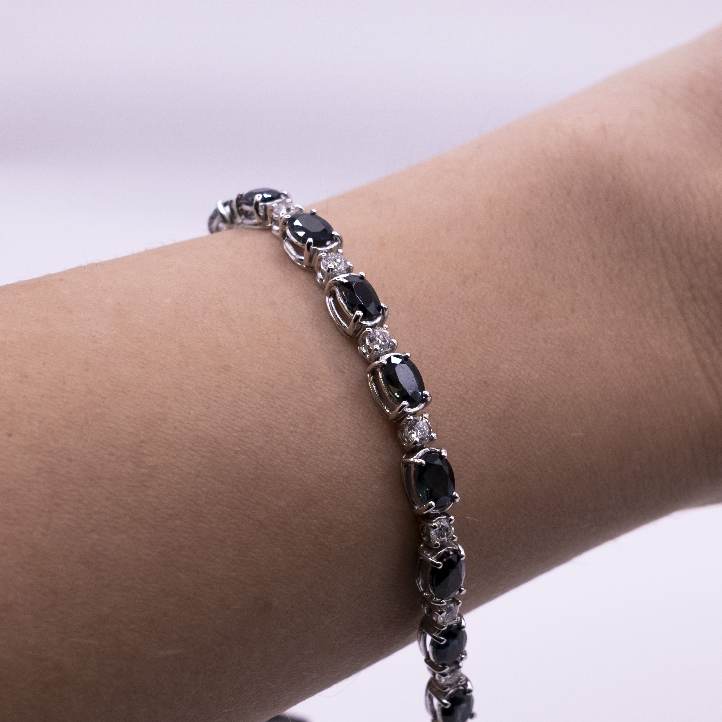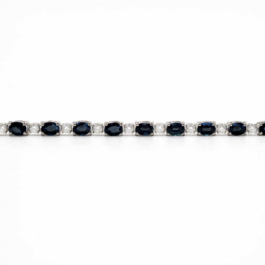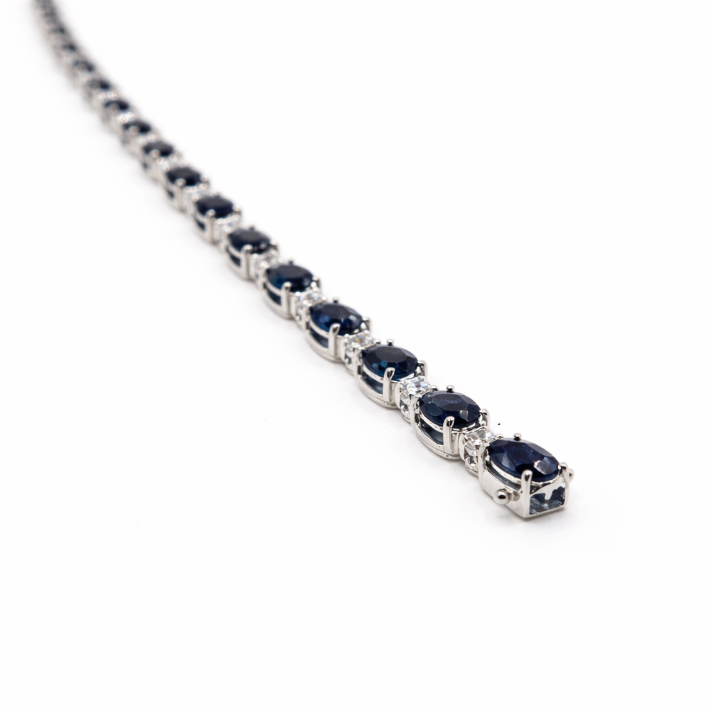 Tennis bracelet IS161 with 19 oval cut sapphires of 9.34 ct. 19 diamonds 1.14 ct. and 12.70g of 18kt white gold