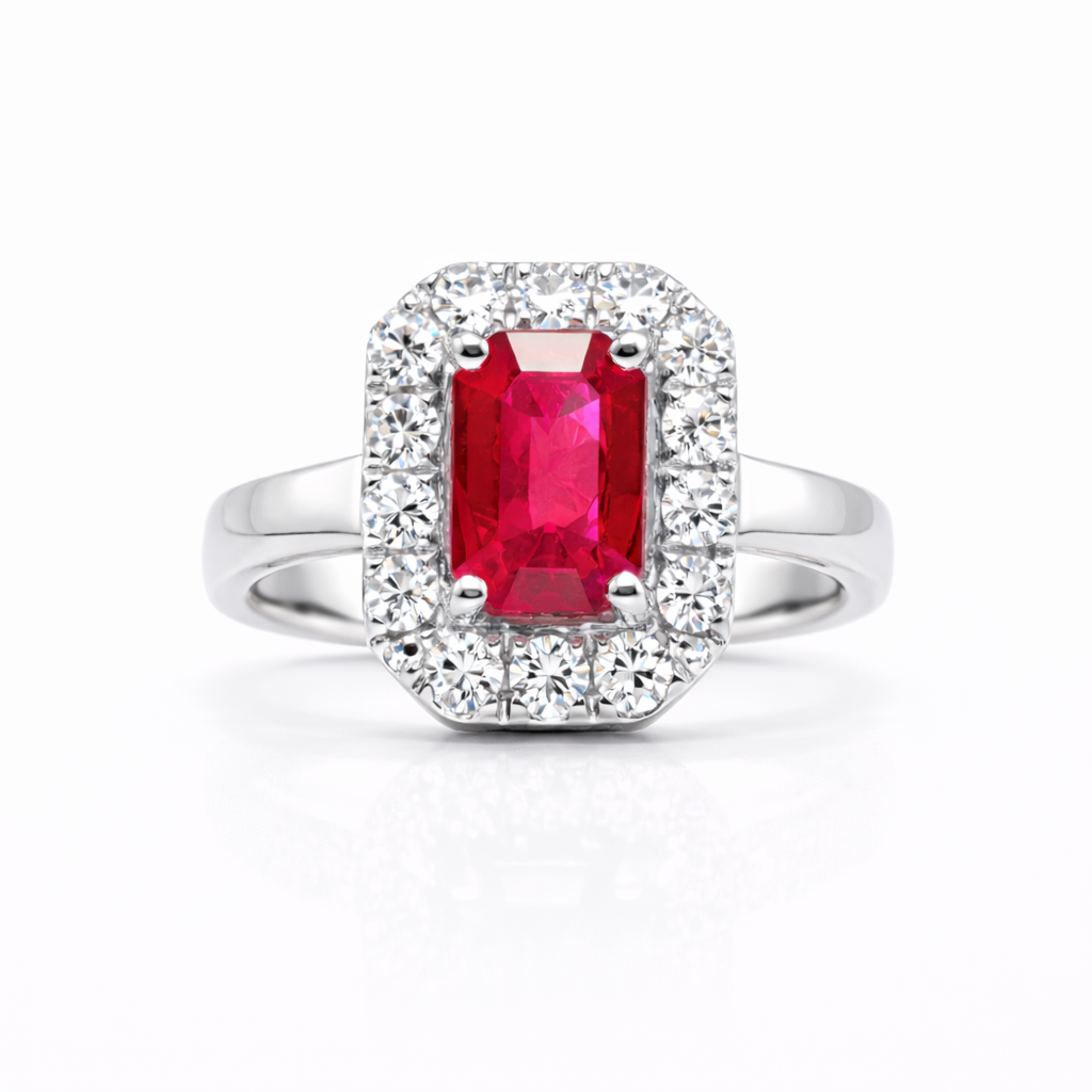 Anello IS127 con 1 rubino da 1,14ct 14 diamanti da 0,44ct e 4,35g d’oro bianco 18kt