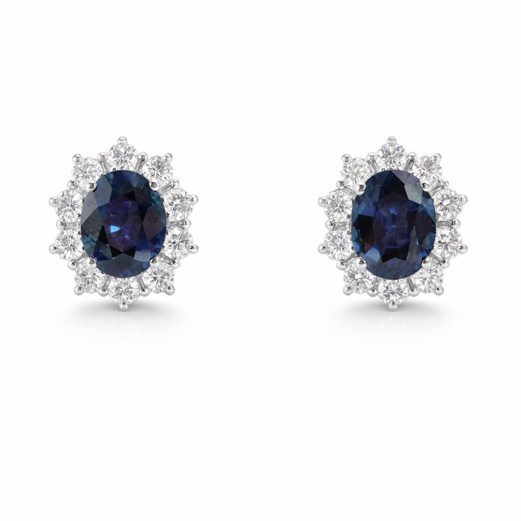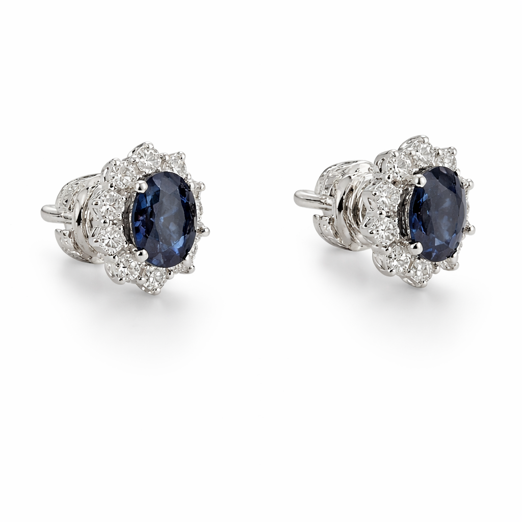 Orecchini IS151 con 2 Zaffiri ovali da 3.33ct, 20 Diamanti da 0.75ct e 4.35g d’oro bianco 18kt